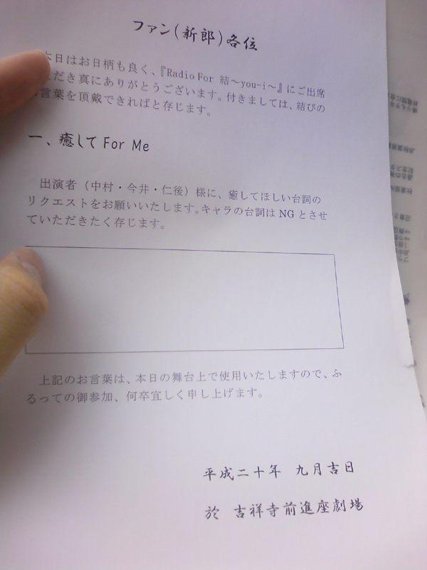 パワプロであおいちゃん、みずきスキーな俺としてはこの話題に乗り遅れるワケにはいかん。 http://www.sanspo.com/shakai/news/081117/sha0811170504004-n1.htm 史上初女性プロ野球選手は16歳女子高生! あおいちゃんやみずきはプロになったのは高校(あるいは大学)卒業後であったが、 なんと現役女子高生とは… ていうか、関西独立リーグなんてものが創立されるのも知らなかったな。 ニュースで動いてるとこ見たけど、かわいかったな…コレはきっと人気出る。 しかし、女の子のプロってのやっぱ変化球メインじゃないと厳しいんだろうな、やっぱり。 サイドスローのナックルボーラーってのがまたそれを物語ってる。 あおいちゃんもみずきもシンカーメインの抑え投手だし。 (場合によっては先発のときもあったけど) 吉田投手もきっと抑えなんだろうなー、にしてもすげえわ。 …絵は全然関係ない、ホーリーナイトドレス千早。 の、ラフ。 PR みるちゅうmiruchu.chu.jp/主催のライブイベント、MusicKnotLedgend Vol20に行ってまいりました! 以前から名前は知ってた「みるちゅう(佳織みちるサン)」だが、 今回ライブイベントにまで行くようになったのには理由があって。 ゲストがえりりんblog.livedoor.jp/eriko_diary/だったのですよ、ええ! こりゃもう行くっきゃねぇ、とチケット購入。 で、今日が(昨日だが)本番だったってワケで。 つまり、本来なら昨日(一昨日だが)の名古屋と連続という予定だったのだ。 恵比寿にある会場の開場が18時だったので、昼はゆっくりと出発。 …時間決めてなかったんで、新幹線自由席にしたんだが、あんなに混んでるとは… 品川着、山手線で恵比寿へ。 21時ごろ終了予定、とみるちゅうにメールで確認していたので、帰りに徒歩でかかる時間を計りつつ、会場。 つーか、雨が…雨が冷たい。 傘持っていかなかったらマジでアウトだったなありゃ。 開場。 こういうガチでライブハウス、ってとこは初めてで新鮮だった。 (アイマスのライブハウスステージを思い出してもらえれば、まさにあんな感じである) 今日は名古屋まんだらけでアッキーとあさぽんのサイン会! ……だったんだけどねー。 仕事から昨日夜帰ってきて、22時頃スレ覗いて、 10人くらいうろうろしてるだのなんだの見て 「まぁ俺は素直に朝一くらいに出よう」と思って早めに寝て。 5時ごろ起きて出かける準備する前にまたスレ覗いたら 「既にン百人単位で人がいる」とか…… 結局朝6時くらいの時点で出発断念\(^o^)/ ファミリースキーの続編来た!って事で早速購入してきましたよ。 前作では「みき」を作ってほぼ制覇したのだが zanf.blog.shinobi.jp/Entry/57/ 今回は色々変わってるねえ。 採点システムがそもそも無いから隠し衣装とかの出し方がわからない。 ので、とりあえずアバター作成に精を出す。 左から、ミンゴス・えりりん・ちあキング・アッキー。のつもり。 キャラ名はキングだけ「ちあき」。なんとなくw ミンゴスはもうちょっと眼がぱっちりしてるとバッチリだったのだけど、これはこれでいいかなって。 ていうか、黒髪ロングがこのフェイスしかなくてだね… やっとでたウェデイング衣装のミンゴスと、俺のMii、二人で描く愛のシュプール。 …HDキャプボ、いよいよもって欲しくなってきたな。 先日、狩猟繪メンバーである小鳥君に、 TGSで買ったモンハンの湯のみを送りつけました。 詳しくはこちら→ http://blog.livedoor.jp/imaskai/archives/51116592.html で、そのお返しに、と頂いたのが今日届いたこちら。 北海道でしか売ってない「やきそば弁当」と言う名のカップ焼きそば。 昼飯前に届けば食べたんだがね、まだ食べてない。 右は「ゆきほっぺ」という、雪歩っぽい名前のブッセ。 上から木苺、ダージリン、ハマナスのフレーバー。 こちらから送った湯のみもだが、割れずに・崩れずに届いて何より。 朝新幹線に乗って、10時頃東京に着き、 千葉県の3店舗のアケマスを廻ってとりあえず今宿泊先の近くのネカフェから更新。 前回使ったネカフェからは更新できなかったのに、どうやら今回はできるっぽい。たぶん。 ただ、今回そのつもりがなかった&帰ってから一気に更新するつもりだった& デジカメが用意できたので、ケータイにまったく写真がなかった… とりあえず生存報告。 と、今R4Uに代わる新番組、「アイドルマスターP.S. Producer」の第0回を聞いてる。 まださすがにちょっと硬いな…もっとユルユルな感じを期待。 メール送りたいなー、ネタ弱いんだよなー俺。 10/8から10/13までTGSと5pbのEXTRASTAGEなどに参加するため、しばらく留守にします。 前回、ネカフェやケータイから更新できないと言う事が発覚したので、 とりあえずこの記事に日記的なものを記していこうかと。 …まぁ、ケータイからここのコメント欄へもかけないのでなんとも、だけど。 とりあえず明日の夜は、RadioForYouに代わる新番組が始まるので、 それを聞きにネカフェに行く予定があるから、とりあえず到着報告だけ、かな… では、逝って参ります。 故あって数日あいた