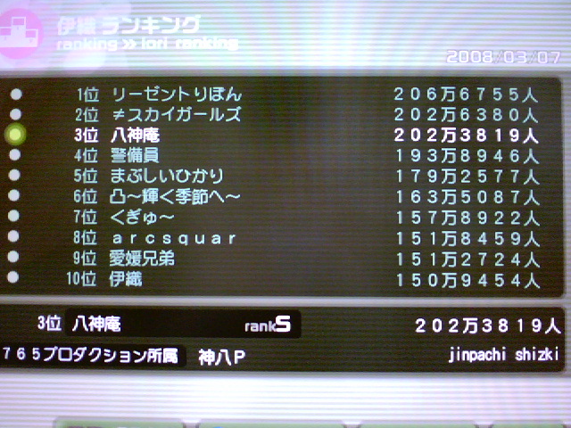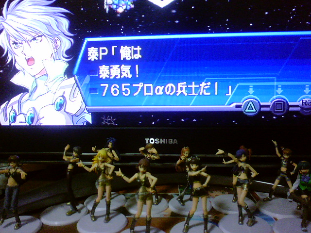 カラオケオフの解散が朝の5時。 Pさんたちの名刺を少し貰ったりしつつ、 俺も次はこれ作ってみようと思いつつ、タクシーを拾い、ホテルに着いたのが朝5時半。 で、初日の荷物整頓して、シャワー入って、着替えて、ベッドに入ったのが朝6時。 目覚ましたち(複数形)をセットし、チェックアウトの10時前に起きようと眠りにつく。 で、何故か目覚ましがなる前に目が覚めた。 本当は体力的に余裕があれば、港の見える丘公園でも行きたかったのだが、 体力的にきつかったので、早めに2日目の目的地、東京・秋葉原へ。 長年の友人、ふじーさんと待ち合わせし、いざアケマス聖地巡業。 だがここでもやはり体力的にきつく、本来の予定より2店舗ほど削っての行動。 アケマス聖地と言えば、やはりサイン台である。 美希役のアッキー(長谷川明子)のサイン台♪ 反対サイドには美希のサインも。 もう1台にはミンゴスのサイン入り台が…だったかな?確か。 数箇所でプレイをし、出勤履歴を更新し、アキバスタートでぐるぐる色々回ってまたアキバへ。 で、まぁ、ワリと満身創痍な中、時間となり岐路に着いた。 帰りの新幹線で寝過ごさないように気をつけたもんだよ… 指定席とったのに周りガラガラだったのはワロタ。 あと、今回の写真は全部自分の撮影したものでは「ありません」。 いくら新型に買い換えたとはいえ、ケータイのカメラではなかなか… せっかくキレイなのを貰ったので、そちらを使わせてもらいました。 オフ会の一次繪、みなとみらいの甘太郎という店でのヤキニク&飲み。 家庭用本スレの紳士たち30人強と、Mixiのアイマスコミュの方々、計100人近くの集まる大所帯に。 いやはや、なんとも凄かったよ、いい意味でw 乾杯の挨拶も「JPY!」とか「アイマス最高!」とか「う~わっほい!」だったりとかだし、 アイマスオンリーイベントの宣伝をする人もあり、 そしてこんな衣装を着てくる人あり これすげえよww 正直コレ着てる人に少し嫉妬したw その発想はなかったわ、ってw 律子スキーな紳士達と同席したのち、2次会のカラオケへ。 0時から早朝5時までアイマス曲オンリーの大カラオケ大会! これがまた燃える燃えるw マイクが2つしかないため、誰かが歌う。 他の人は一緒になって歌ったり、ライブのように歓声を上げたりとまぁ異様な盛り上がり。 俺もヒトカラのかいもあって結構歌った。 それ以上にハイハイフッフー!してた気もするがw ジムの帰りに0時ごろから4時ごろまで一人でカラオケしてた時期もあったので、 まぁ体力的にはワリとまだ余裕あったし。 一発目がふるふるフューチャー☆でラストはアイドルマスターで〆。 途中、迷走Mindを真スキーな真だけの王子様Pと熱唱したり、 スゲー歌上手かったPとrelations一緒に歌ったり、 誰もマイクを取らない中、太陽のジェラシーを俺が歌ったり、と、 正直もんのすごく楽しかった、充実していた。 またライブの時…でなくても、 機会があれば参加してみたいものである。 で、いよいよ18時(少し過ぎ)にライブ開演! 毎度高齢・・・もとい、恒例のぴよちゃんの挨拶に始まり、神曲のオンパレード! 盛り上がる曲の時は思いっきりハイハイフッフーしてたw はっきりいってライブの盛り上がりは文章ではかけない、書きにくい。 DVDの発売を切に願うのだが・・・本気で。 あの感動を再び味わいたい。 3階席でしかも俺目がかなり悪いから、正直よく見えなかったのよね、巨大スクリーンすら・・・・・・ そして今回最大のサプライズ。ヤキニクマンこと串田アキラ登場! ・・・それも確かにサプライズだが。 961プロ登場、そして「たかね」、「ひびき」の復活! 765プロの面々のPへの言葉。流れるPSP版のPVに3人のシルエット。 そして聞こえる美希の声。と、たかね、ひびきの声。 さらに961プロの新曲、オーバーマスター初披露! あの流れと興奮はマジデ現場に行った人間でないと感じられないわホント… 一生物の経験でしたよ。 そして3時間のライブもあっという間に終わり… 変態紳士達の集まるオフ会が始まった。 最近レンタルビデオで、ダイターン→イデオン→ザンボットと黒冨野作品見まくってた俺が、 本放送以来久々にスクライドを見た。 やっぱこれが凄まじくいいわ…何がいいとか今更言ってもアレだけど。 最終決戦でブチ切りみたいな作品も多いけど、無常との戦いの後で2話も尺取ってるのが丁寧だよ。 DVDBOXはなんか今出てるのは劇中曲が差し替えられてしまったっぽいのでとりあえず見送り。 代わりにサントラ2枚とも注文した。BGMもいい曲多いんだ、これが。 まあ既にプロデュース完了したの相当前なんだけどね…… 一応このくらい行きましたよ、と。 で、最近はファミリースキーが面白い。 っていうかコレももう既にほぼ過去形。 もう相当やってあとは全コースでSSランクとるだけ。 あと15点位でコンプ。 だが、この段階においてもまだアイマス板が出てこない。 ジム→アケマスも久々に行ってきた。 昔から使ってたケータイ(まだJ-Ph